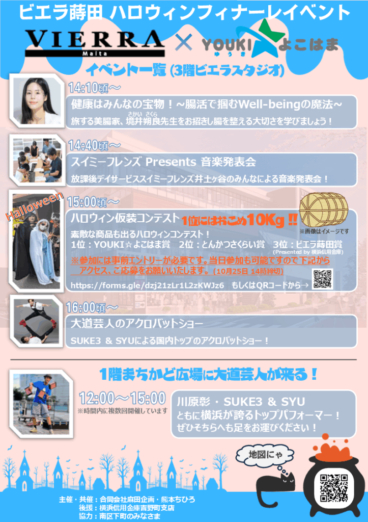 日時:令和7年10月25日(土) 14時~17時 イベント内容:美を目指す腸活セミナーや音楽発表会 トップパフォーマーによる大道芸 ハロウィン仮装コンテスト! 見事1位に入賞された方(グループ参加可)には、新米10Kgを贈呈いたします! ※参加には事前エントリーが必要(無料)です。 枠に空きがある場合は当日エントリー可能ですが、お早めにエントリーをお願いします! ※定員に達し次第受付を終了いたします エントリーは下記URL、お電話でも可能ですのでお気軽にお問合せください。 詳しくは下記添付画像もご確認ください。