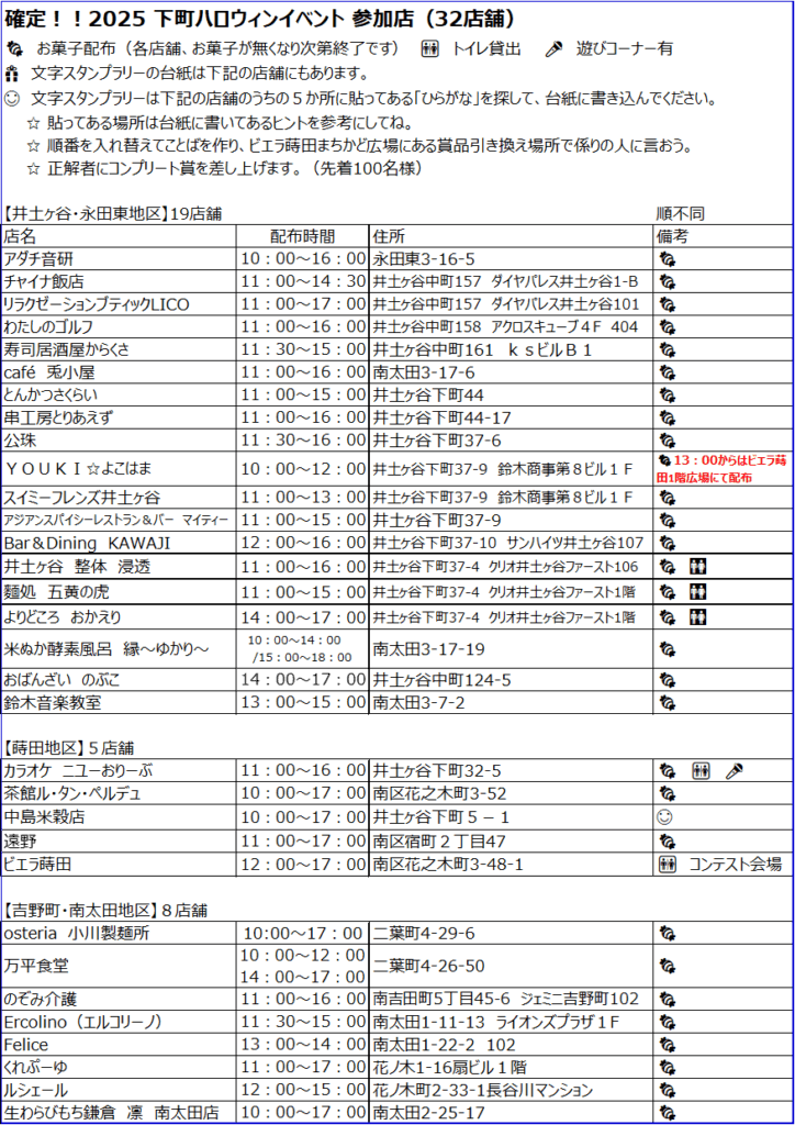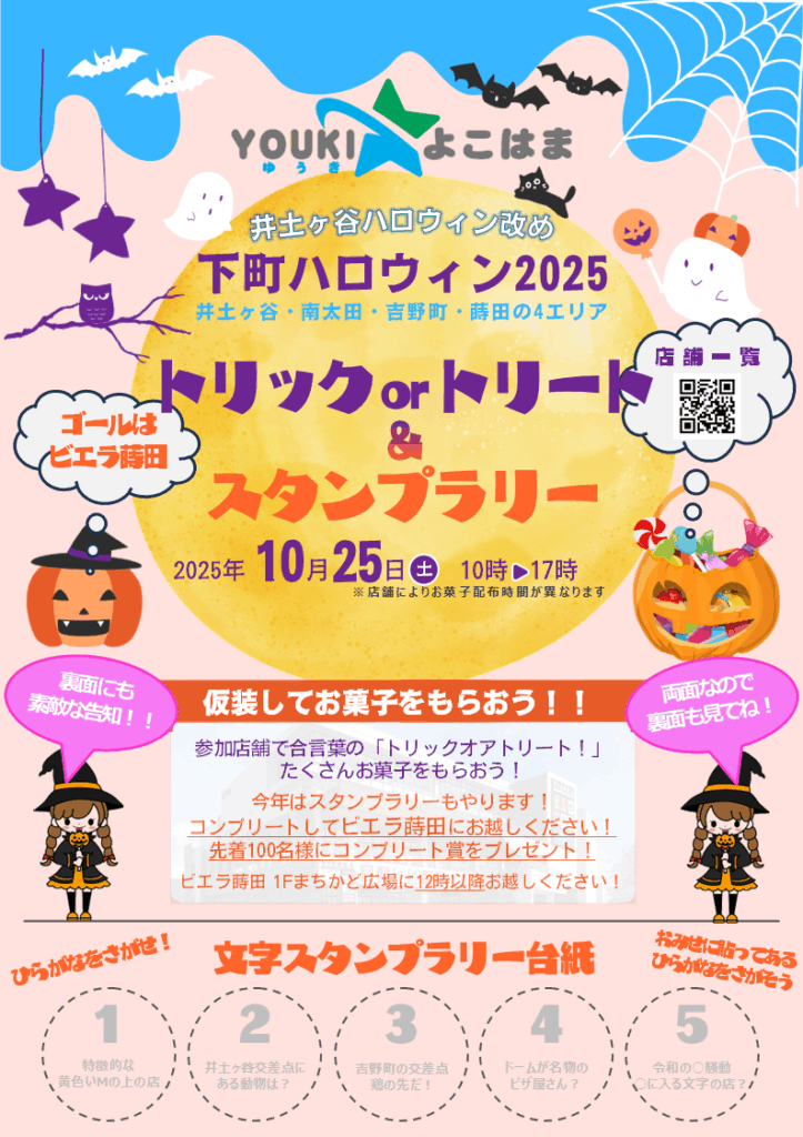 日時 :令和7年10月25日(土) 10:00~17:00 (雨天決行) ※店舗により実施時刻が異なります。下記添付画像をご確認ください 開催地区:井土ヶ谷(永田東含む)・南太田・吉野町・蒔田 イベント内容:ハロウィンにちなんだ仮装をしてきた皆様へお菓子のプレゼント! ひらがなスタンプラリーコンプリートによるコンプリート賞のプレゼント!(受渡はビエラ蒔田にて)
