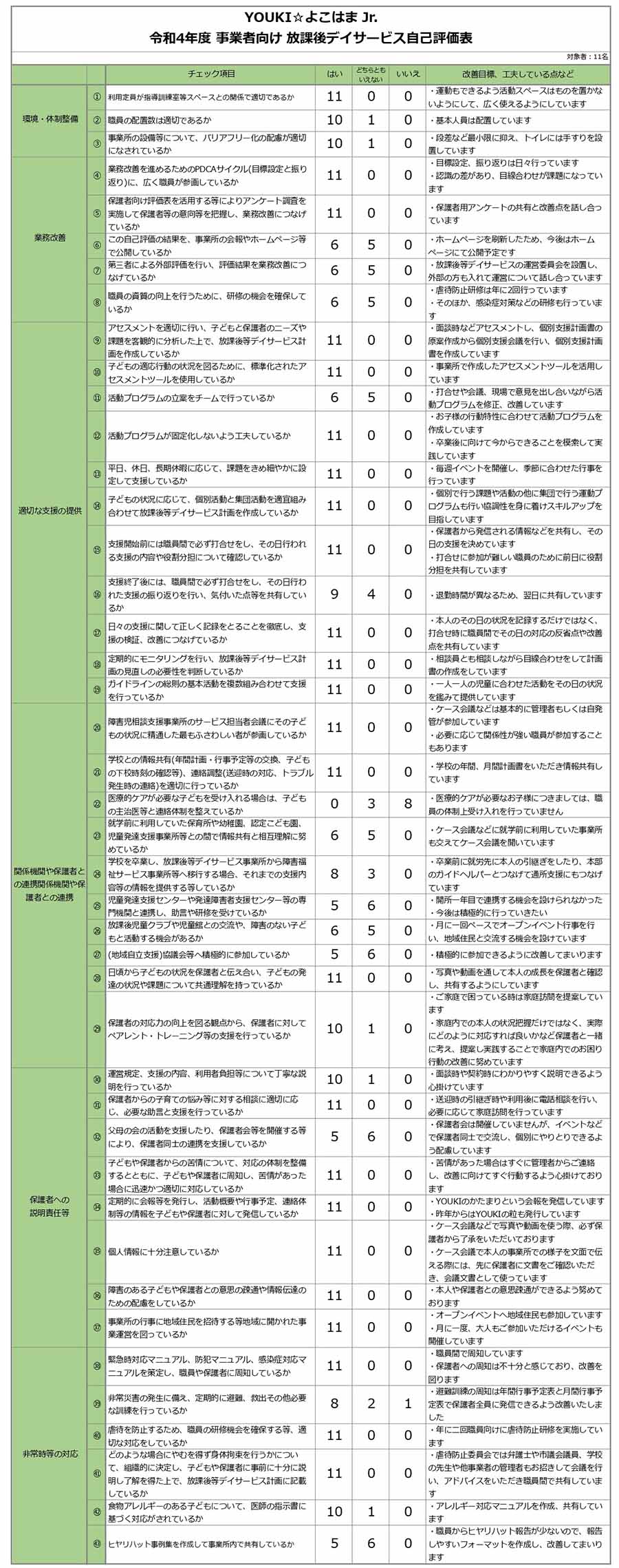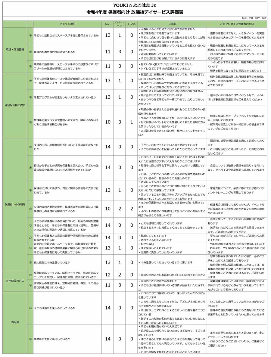 放課後等デイサービスガイドラインに基づく評価を実施し、「放課後等デイサービス自己評価結果」(保護者向け・事業者向け)がまとまりましたので、ここに公表します。 アンケートにご協力いただきました保護者の皆様、この場をお借りして厚くお礼申し上げます。