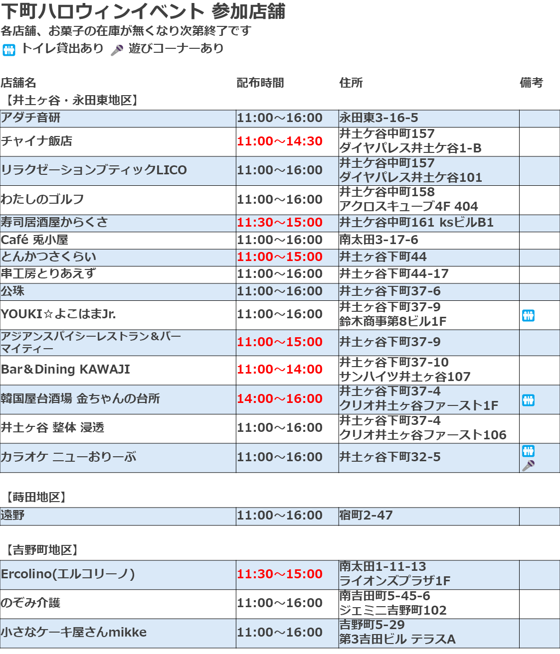 イベント名称:下町ハロウィンイベント 日時 :令和6年10月26日(土) 11:00~16:00 (雨天決行) ※店舗により実施時刻が異なります。下記画像をご確認ください 開催地区:井土ヶ谷(永田東含む)・吉野町・蒔田 イベント内容:ハロウィンにちなんだ仮装をしてきた皆様へお菓子のプレゼント!